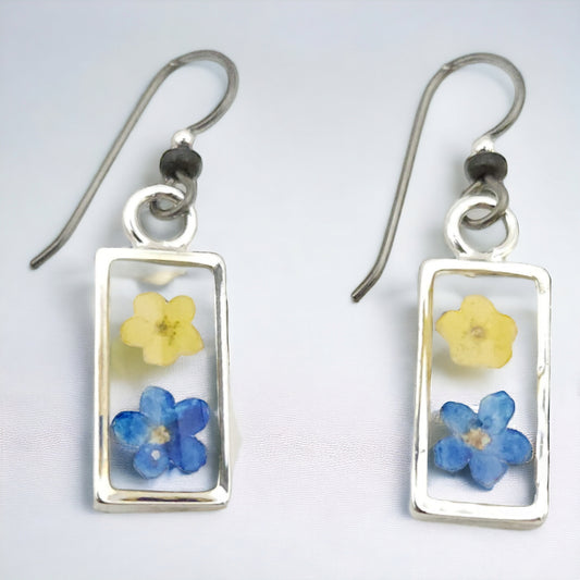 Forget-me-not Blue and Yellow Flower Earrings In Small Silver Bezel